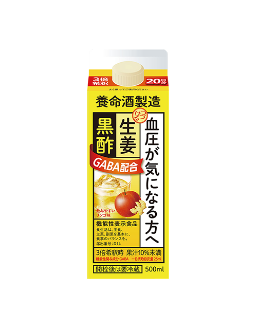 黒酢と生姜の組み合わせに血圧が高めの方に適した機能があることが報告されているGABAを配 合した「血圧が気になる方へ」向けた機能性表示食品の黒酢ドリンクです。1日当たり本品25mlを目 安に、水やお湯等50mlで3倍に薄めてお召し上がりください。リンゴ果汁(3倍希釈時 10%未満)を 加え飲みやすく仕上げており、毎日飲んでも飽きない飲み口です。