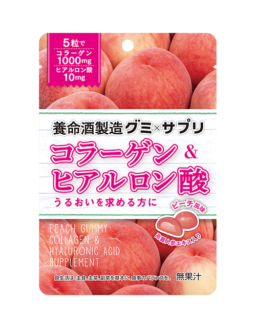 『グミ×サプリ コラーゲン&ヒアルロン酸』はコラーゲンにヒアルロン酸を組み合わせた、うるおいを求める方に向けた商品です。1日約5粒食べるだけで、コラーゲン1000㎎、ヒアルロン酸10mgを摂取できます。桃のやさしい香りと甘さが感じられる味わいです。